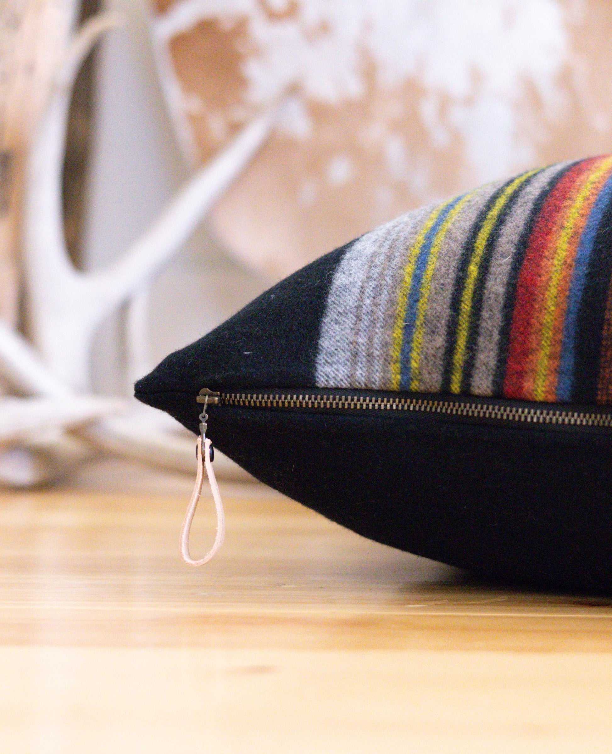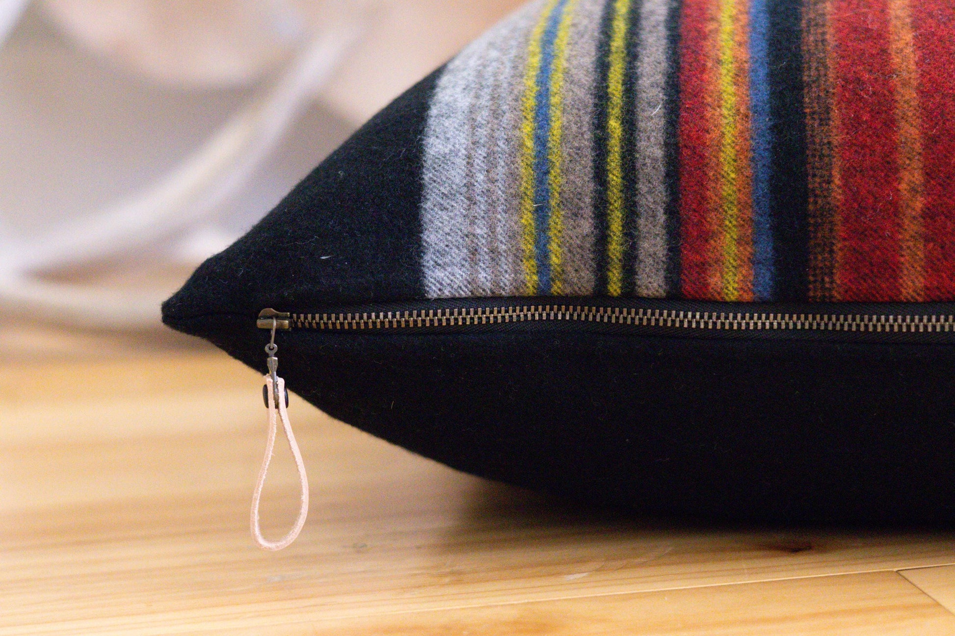 Each pillow cover is made-to-order in Ridgefield, WA with matching solid wool back. All seams are triple-stitched, with reinforced corners and a metal YKK zipper with leather pull for durability.