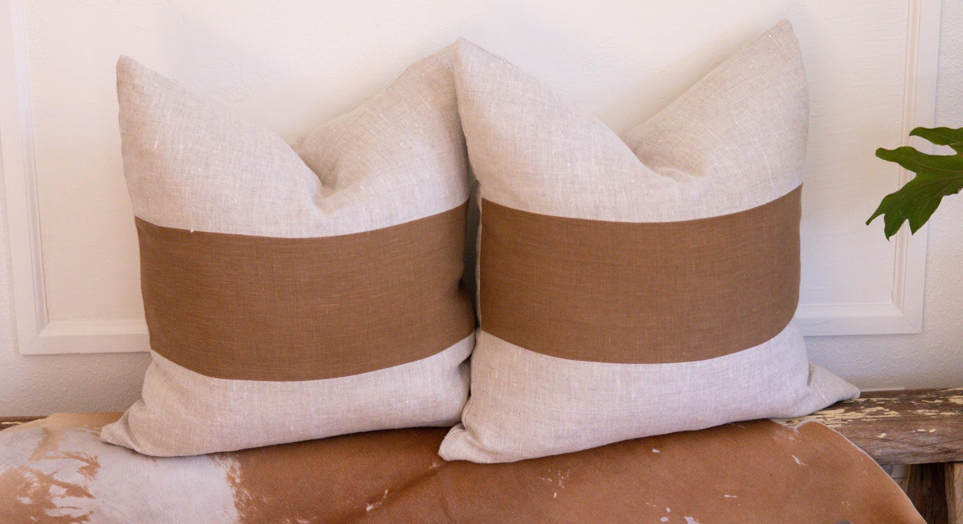 Bring natural texture and subtle warmth to your home with this handcrafted colorblock linen pillow cover. The front features a caramel and beige panel, while the back is solid beige (natural) European linen. Finished with an ivory invisible zipper in the bottom seam, this pillow cover is thoughtfully made to blend style, durability, and sustainability.
