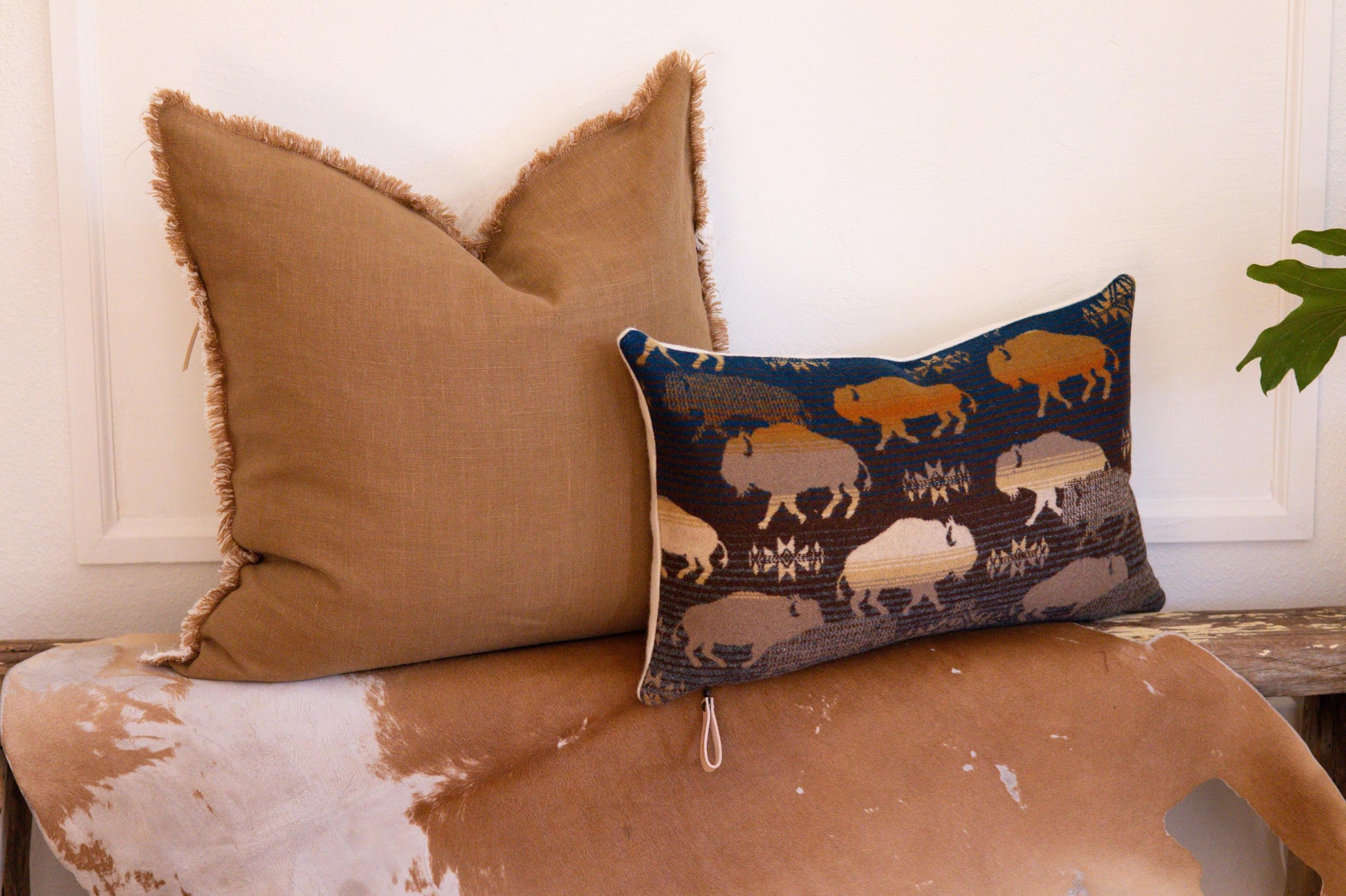 Add natural warmth and timeless texture to your home with this ready-to-ship caramel linen pillow cover. Crafted from 100% European linen, this cover features raw fringed edges, a topstitched YKK metal zipper, and a custom leather pull. The front is rich caramel, and the back is natural beige, making it a versatile, all-season accent. Perfect for layering on sofas, beds, or accent chairs.