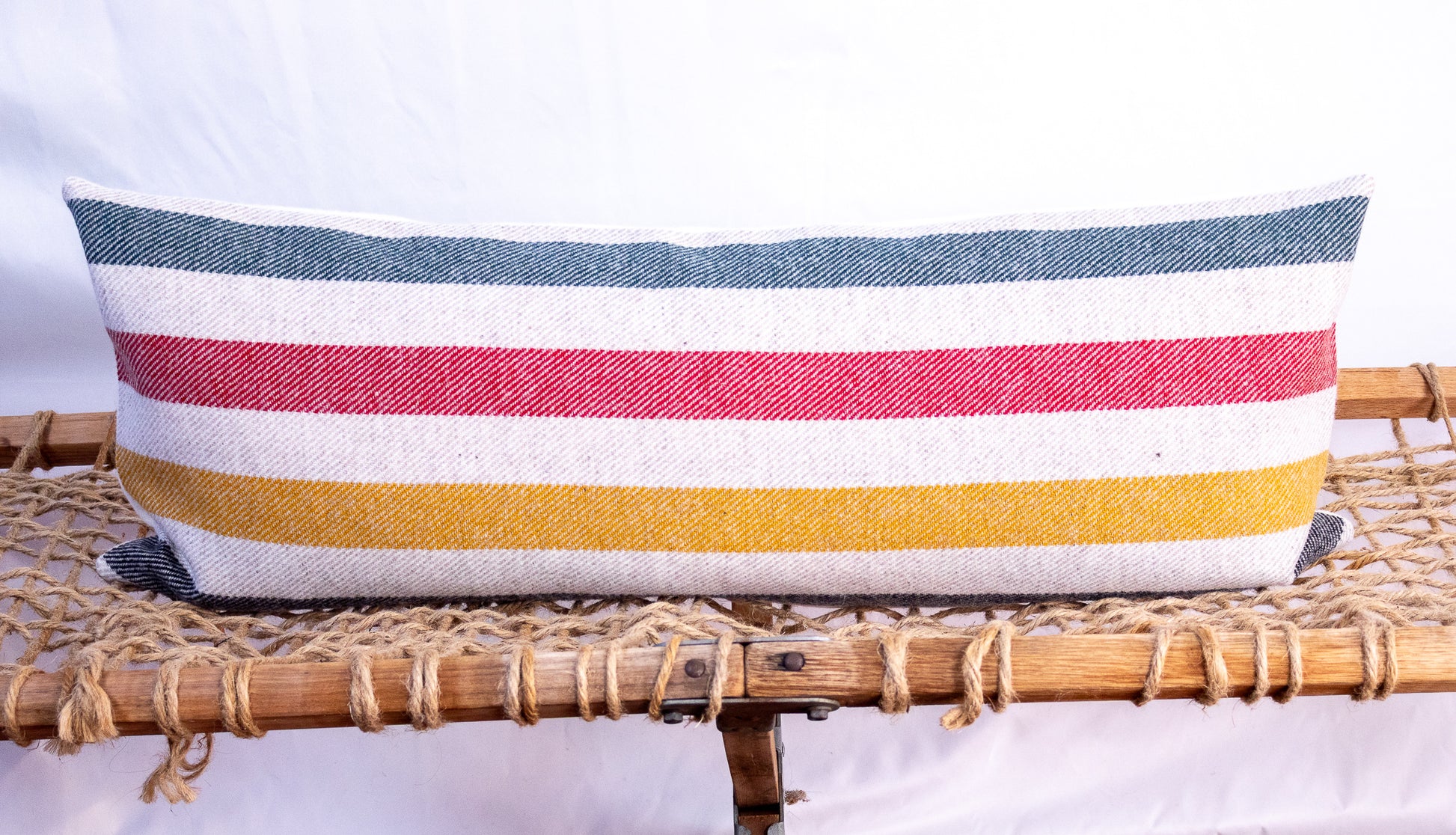 The muted, oatmeal-based stripe — with quiet accents of black, yellow, red, and green — is understated enough to live in any room, yet unmistakably iconic. Backed in Pendleton® ivory blanket weight wool for a clean, balanced finish.