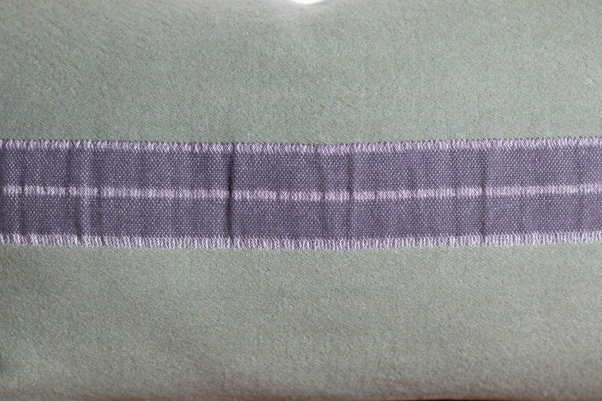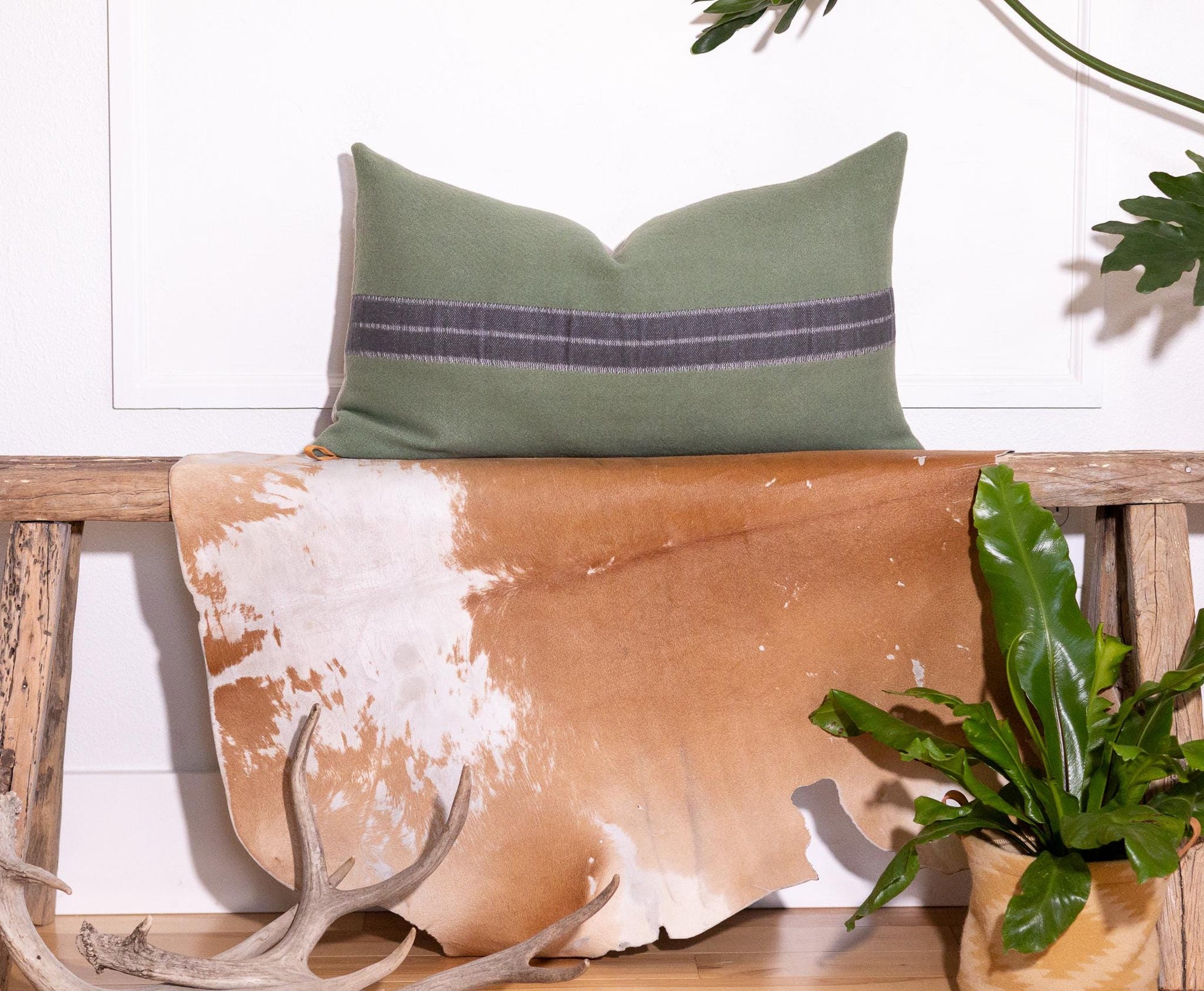Bring texture and heritage charm to your space with this exclusive lumbar pillow cover. Made from upcycled Pendleton® wool in deep green with a charcoal stripe and paired with a neutral linen back, each cover is one of only two ever made. Finished with a durable metal YKK zipper and custom leather pull for a refined, lasting touch. Perfect for styling on sofas, benches, or beds.