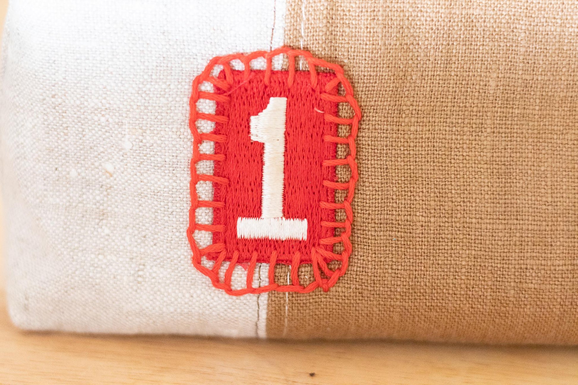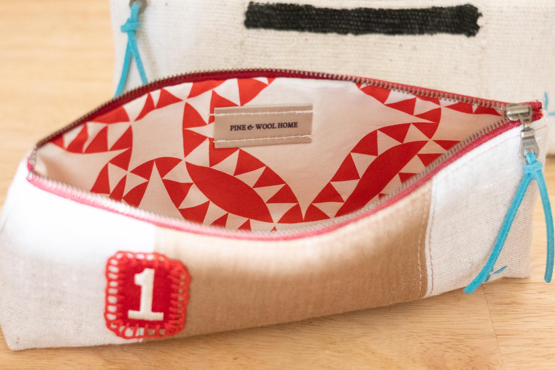 A modern, handcrafted zippered pouch infused with heritage style. Made from authentic natural and tan European linen, this small bag is designed for everyday essentials—whether you're storing art supplies, cosmetics, or travel necessities. A hand-embroidered turquoise Swiss Cross adds a distinctive touch, while the exposed metal YKK zipper lends a sleek, durable finish. The inside is lined with white and red vintage-style fabric, making each piece one of a kind.