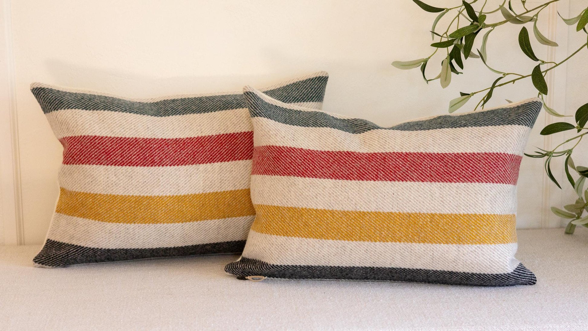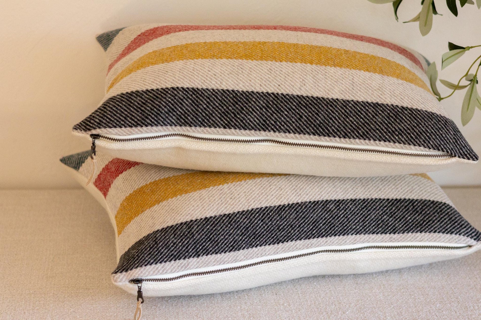 Bring a classic piece of American design into your home with this set of two pillow covers, handcrafted from Pendleton®’s Glacier National Park Eco-Wise wool blanket. Soft oatmeal ground with iconic black, yellow, red, and green stripes on the front, solid ivory wool on the back. Durable, stylish, and ready to ship—perfect for sofas, cabins, or guest rooms.