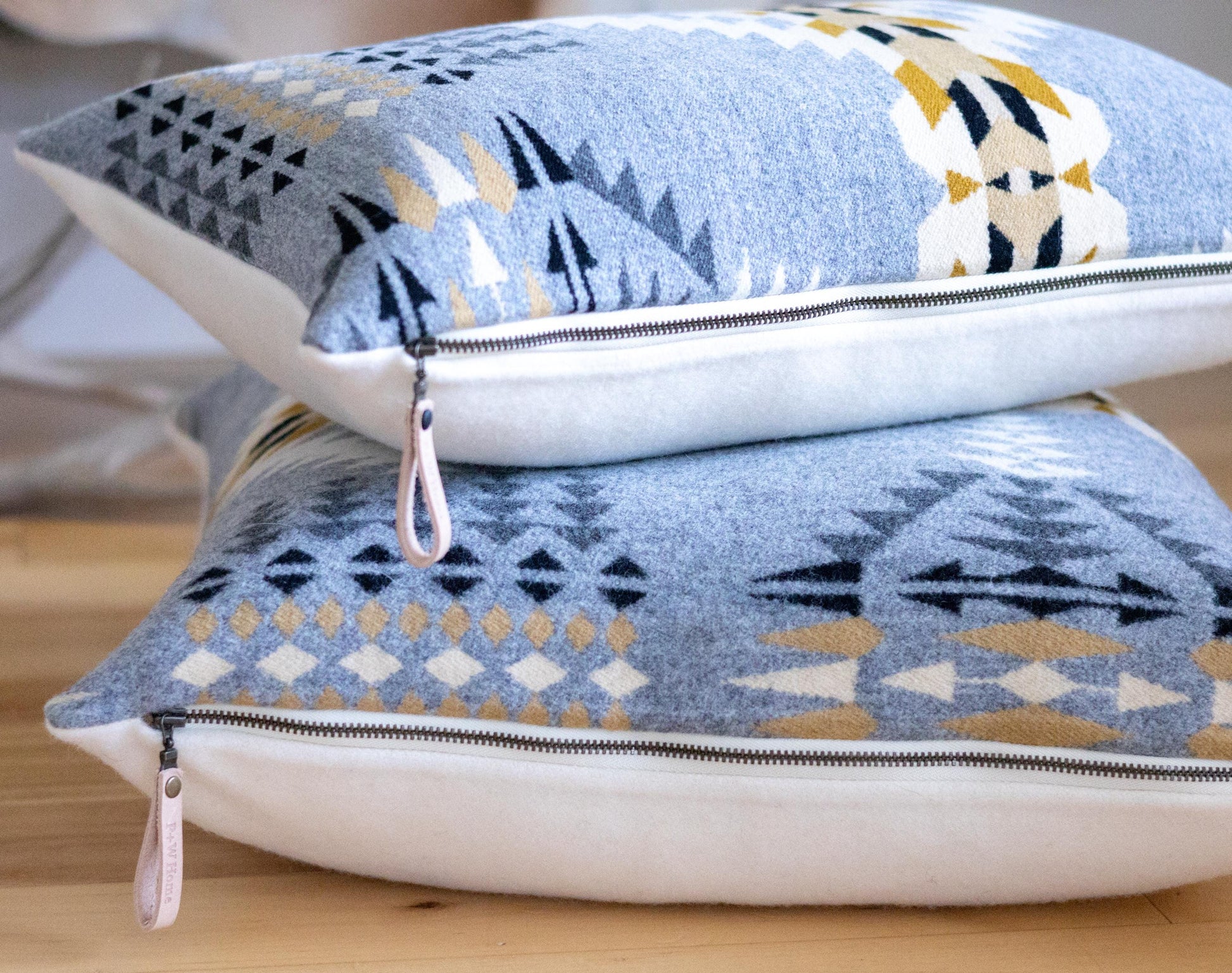 This handcrafted pillow cover features Pendleton®’s Rancho Arroyo wool in the gray colorway—a rich geometric jacquard pattern in gray, tan, ivory, and black on the front. The back is solid cream Pendleton® wool, finished with a high-quality metal YKK zipper and custom leather pull for a refined, durable touch.
