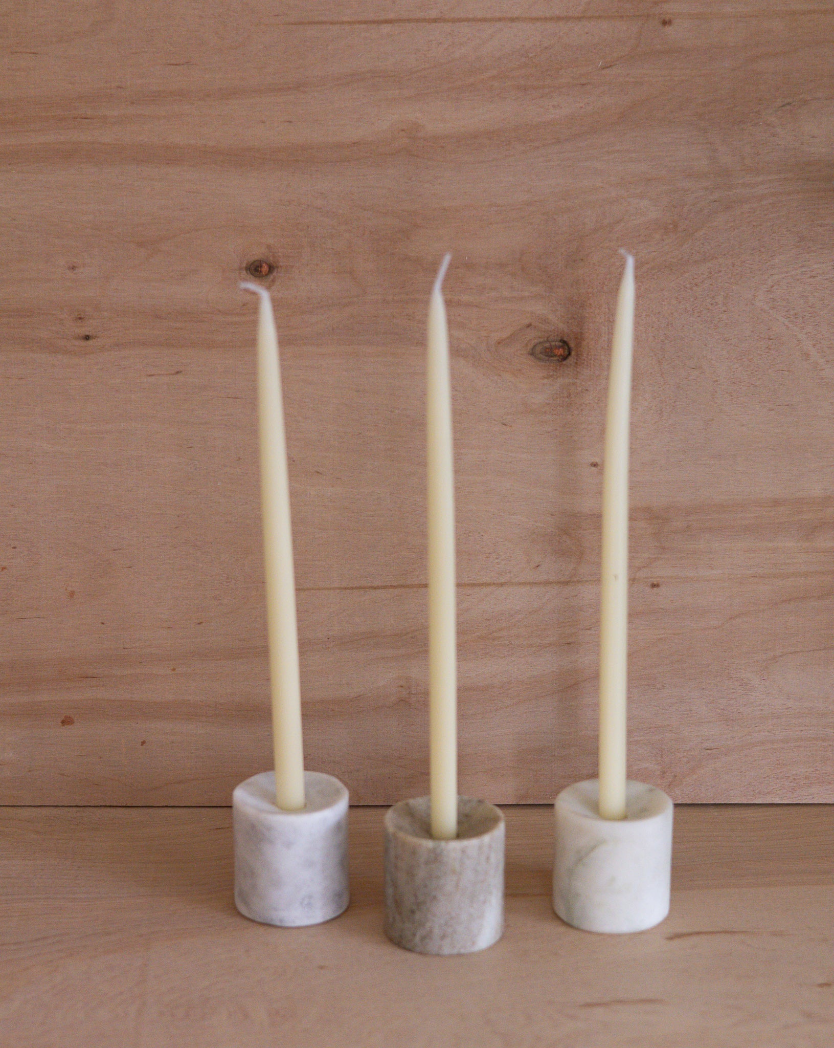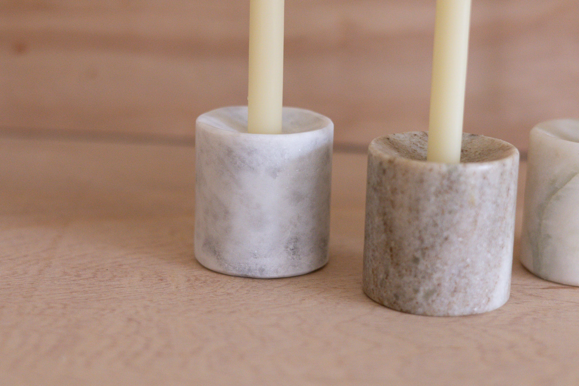 Sleek, minimal, and effortlessly modern—this trio of marble candle holders brings natural beauty to any space. Each set includes three uniquely colored marble holders, perfectly sized for a ½-inch diameter taper candle. To make styling even easier, we’re including three 10” taper candles so they’re ready to glow as soon as they arrive. Whether placed on a mantel, dining table, or styled on a shelf, these petite holders add just the right amount of warmth and sophistication.