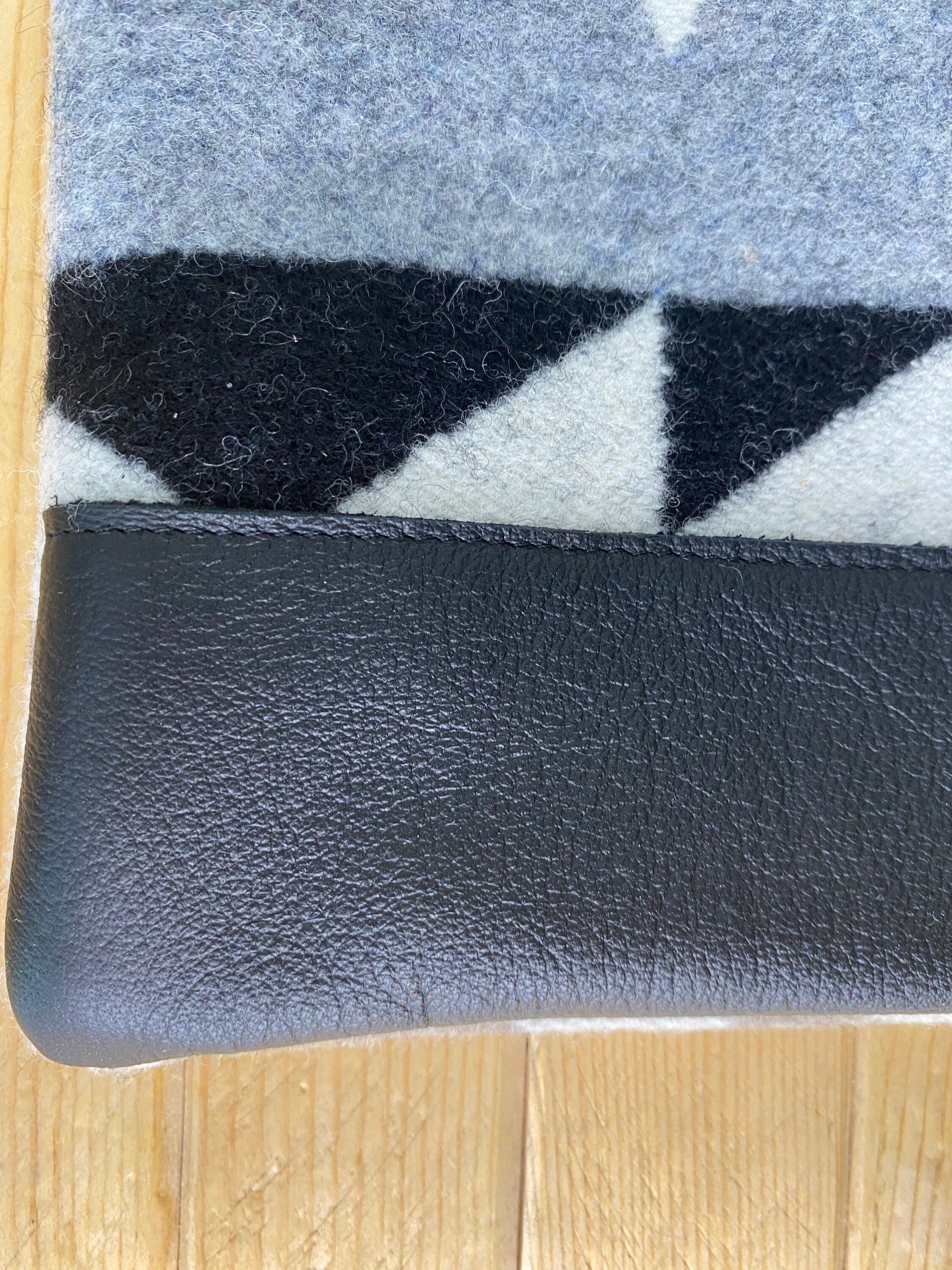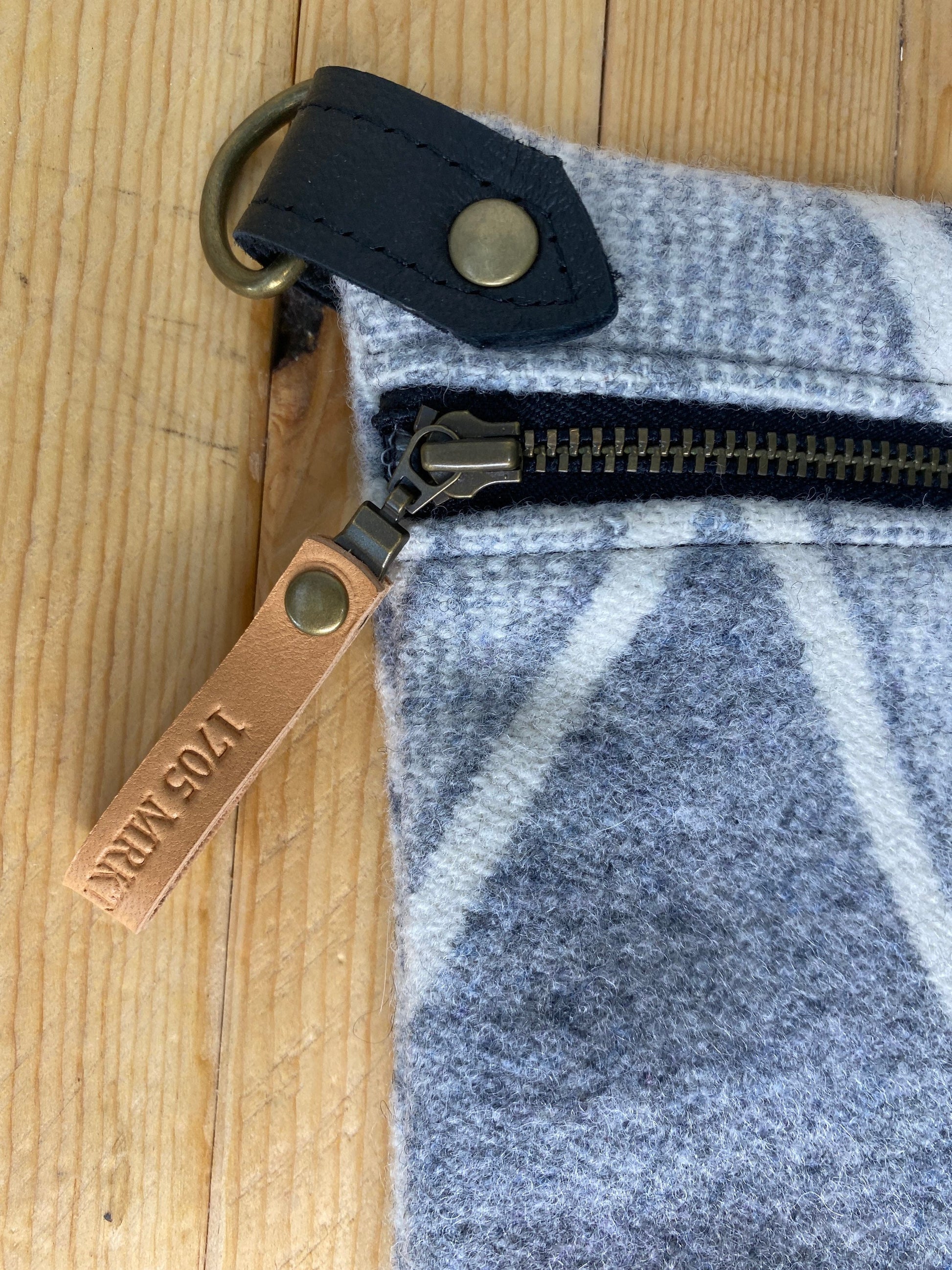 This zippered electronics sleeve is made with the gorgeous Diamond Ridge Pendleton® wool on the front and back and features a genuine leather strip on the bottom, which has been topstitched. Constructed with durable nylon thread this 12" x 8" bag features a full length antique brass YKK metal zipper with leather pull. Attached a the top corner is a leather strap with an antique brass D ring affixed with a metal rivet so you can clip this pouch inside a bag or use it as a clutch with a wristlet strap.