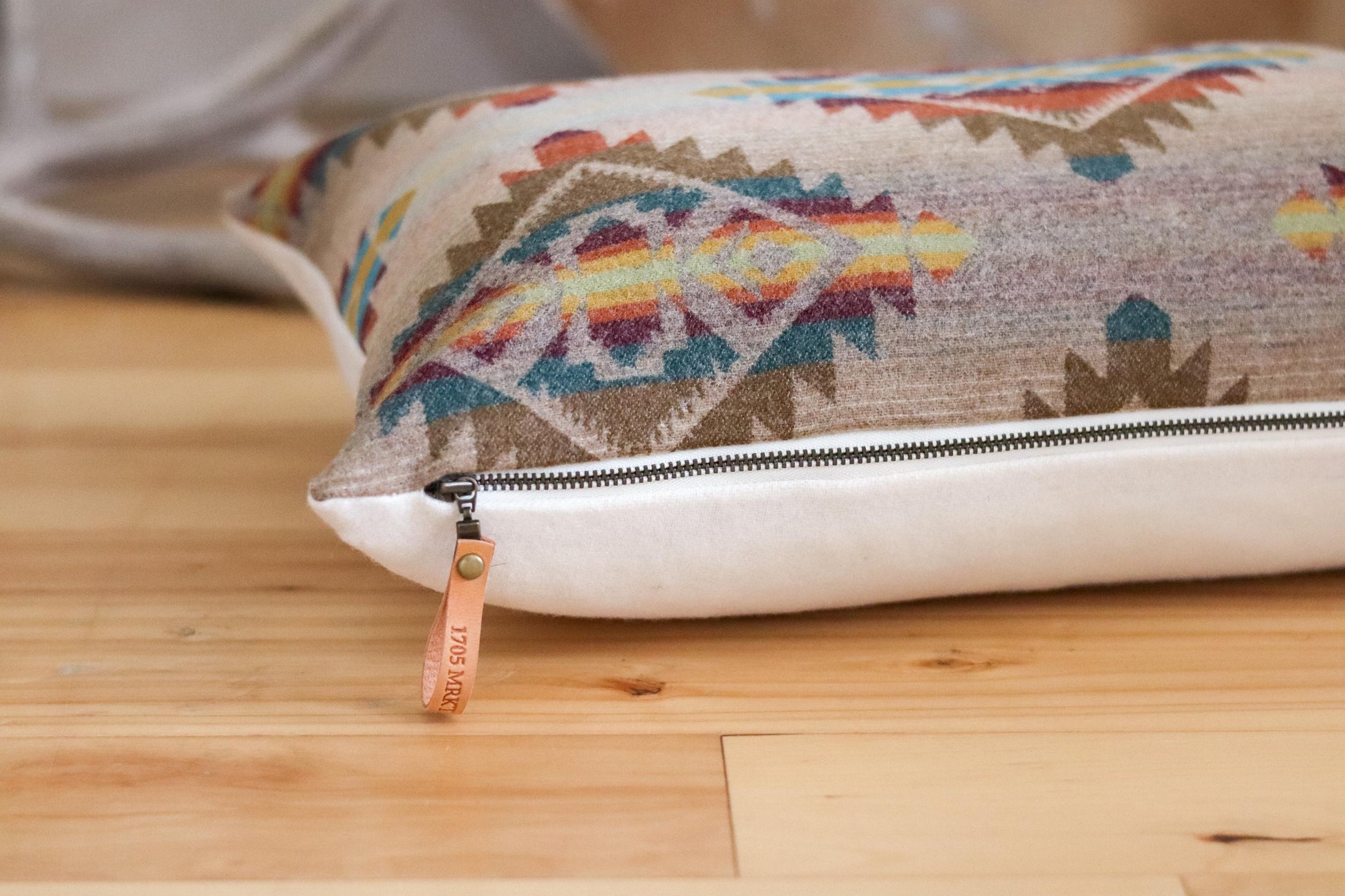 Add a pop of Southwestern charm with this one-of-a-kind 12"x18" pillow cover, made from Taos Trail lightweight jacquard wool on the front and solid ivory wool on the back. Finished with an exposed metal YKK zipper and custom leather pull, each piece is triple-stitched for durability and made with care in Ridgefield, WA. Perfect for bedding, seating, or layering with other accent pillows.