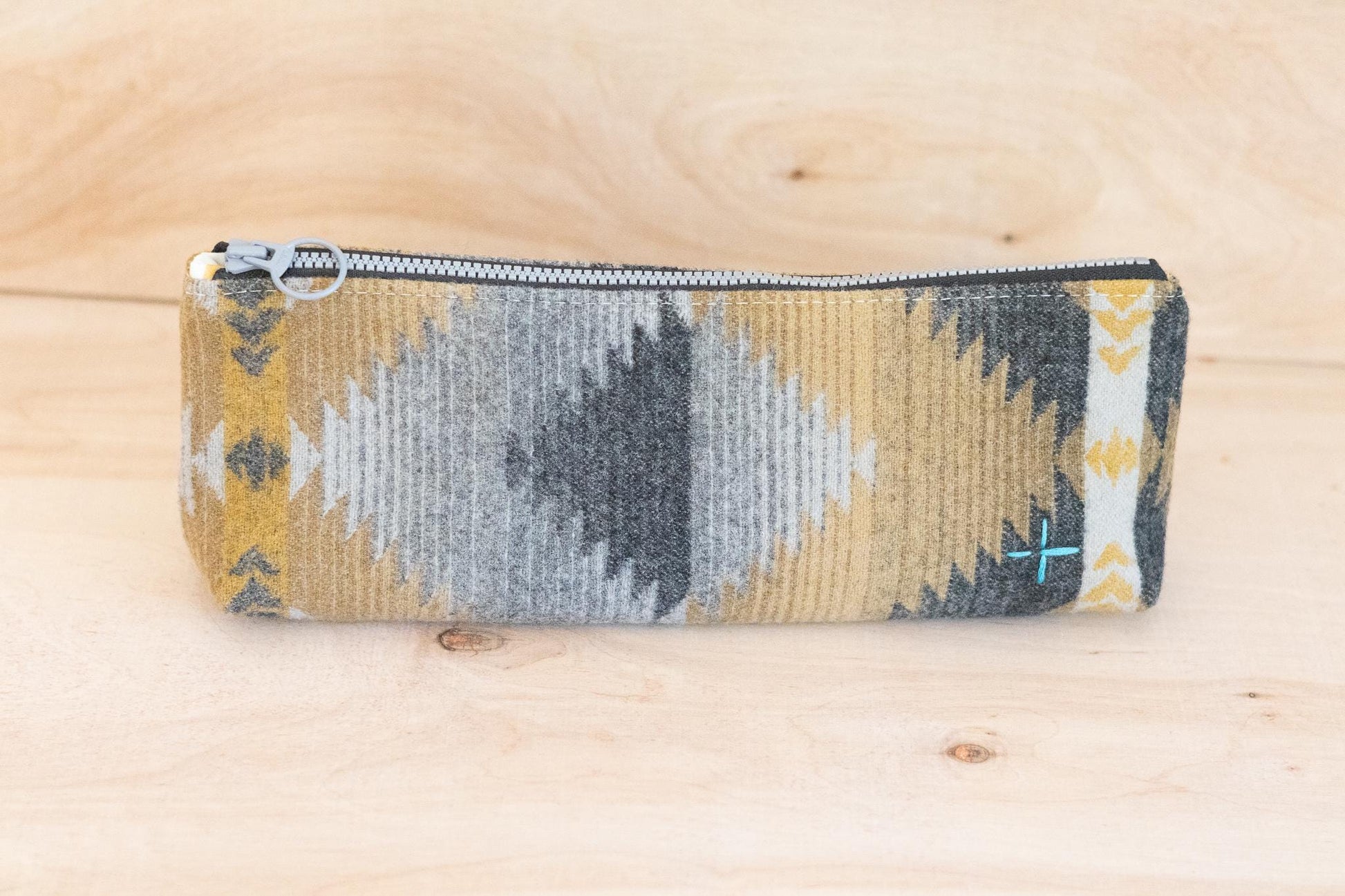 A modern, handcrafted zippered pouch infused with heritage style. Made from authentic Cape Creek Grey Pendleton® wool, this small bag is designed for everyday essentials—whether you're storing art supplies, cosmetics, or travel necessities. A hand-embroidered turquoise Swiss Cross adds a distinctive touch, while the decorative YKK zipper lends a sleek, durable finish. The inside is lined with vintage-style mustard and white fabric, making each piece one of a kind.